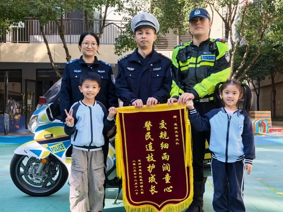 一面红彤彤的锦旗,一份沉甸甸的认可。12月18日上午,惠阳区星河幼儿园内暖意融融,该园负责人将一面写有“交通细雨润童心,警民连技护成长”的锦旗,郑重交到惠州市公安局惠阳分局交通管理大队民警手中,以此感谢交管部门长期以来的安全守护与上午开展的精彩交通安全宣传活动。