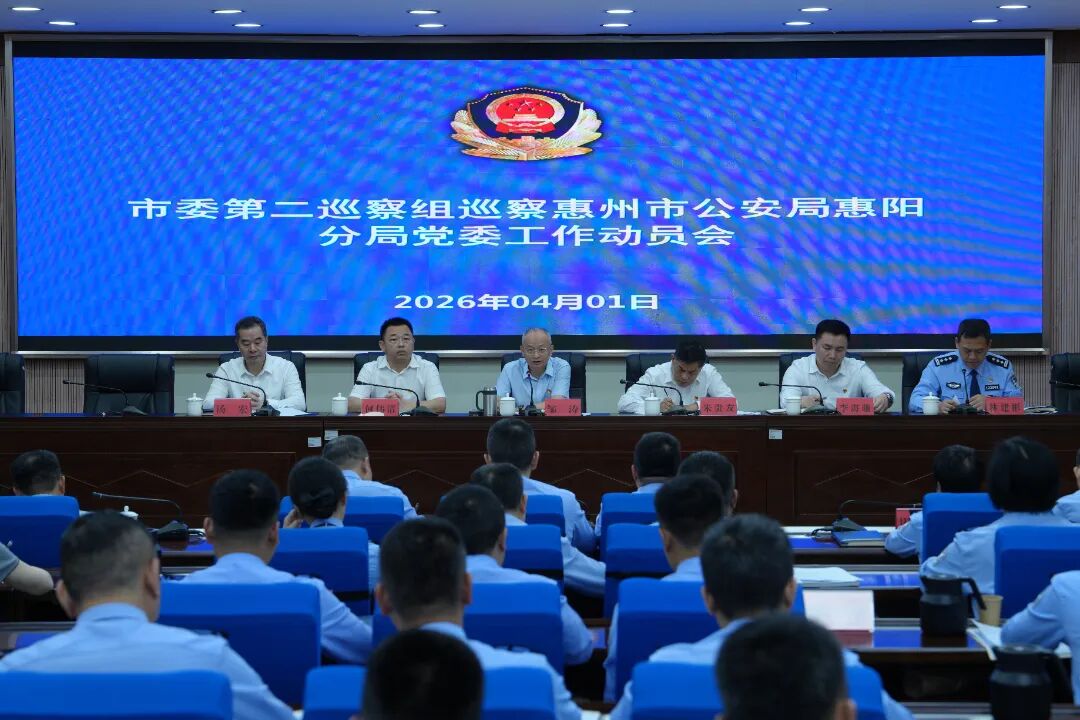 根据市委巡察工作的统一部署,2026年4月1日,十二届市委第九轮巡察第二巡察组巡察惠州市公安局惠阳分局党委工作动员会召开。会前,市委第二巡察组组长邹涛主持召开与惠阳区副区长、分局党委书记、局长、督察长林建彬的见面沟通会。动员会上,邹涛通报了巡察任务和工作安排,并就巡察工作提出要求,林建彬主持会议并作表态发言。